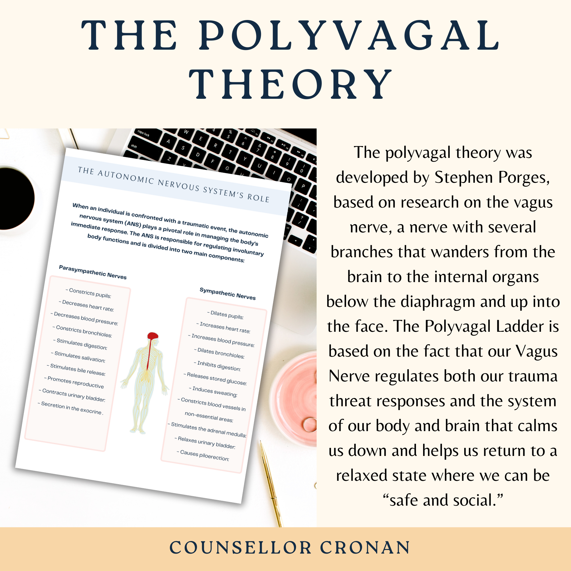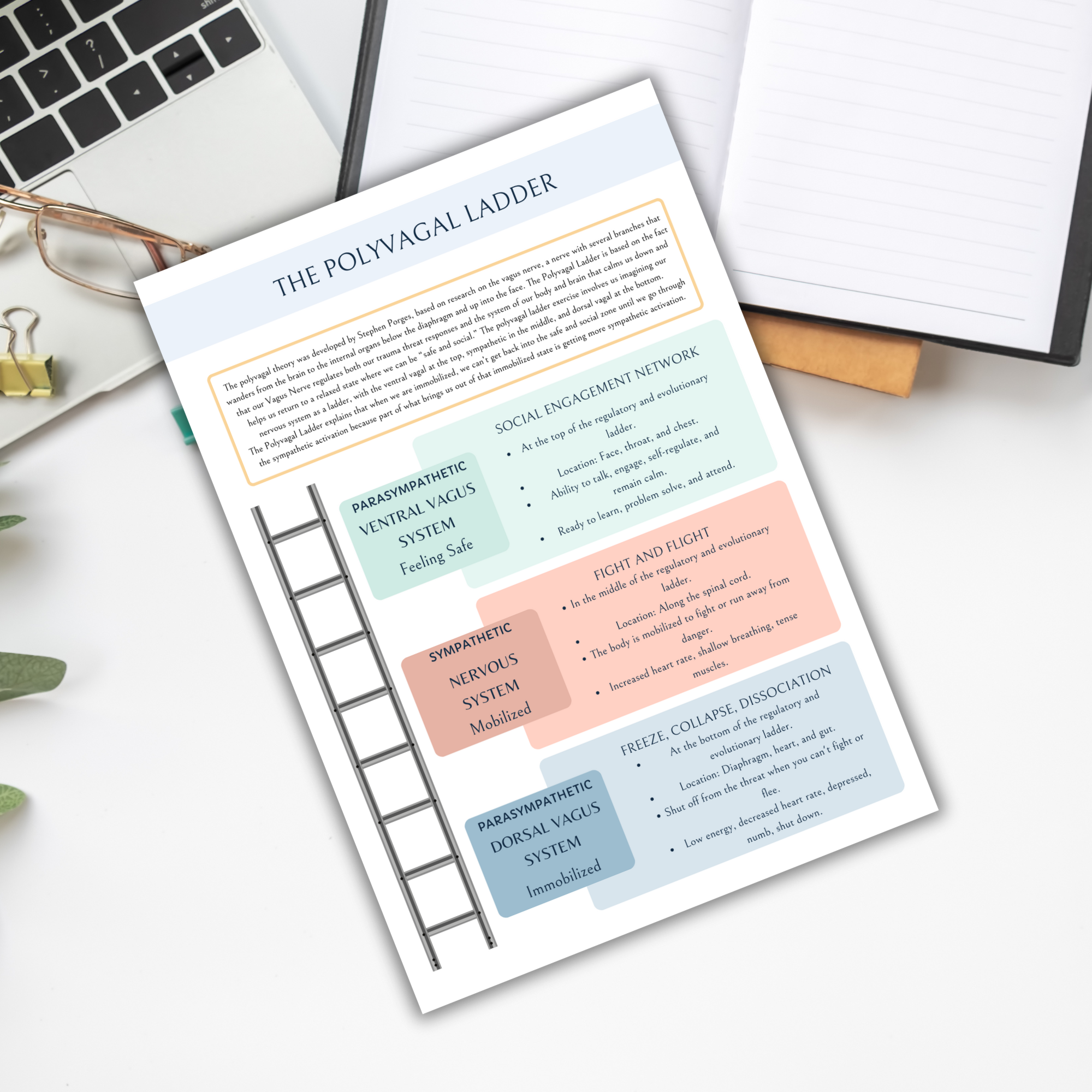 The polyvagal theory was developed by Stephen Porges, based on research on the vagus nerve, a nerve with several branches that wanders from the brain to the internal organs below the diaphragm and up into the face. The Polyvagal Ladder is based on the fact that our Vagus Nerve regulates both our trauma threat responses and the system of our body and brain that calms us down and helps us return to a relaxed state where we can be “safe and social.”