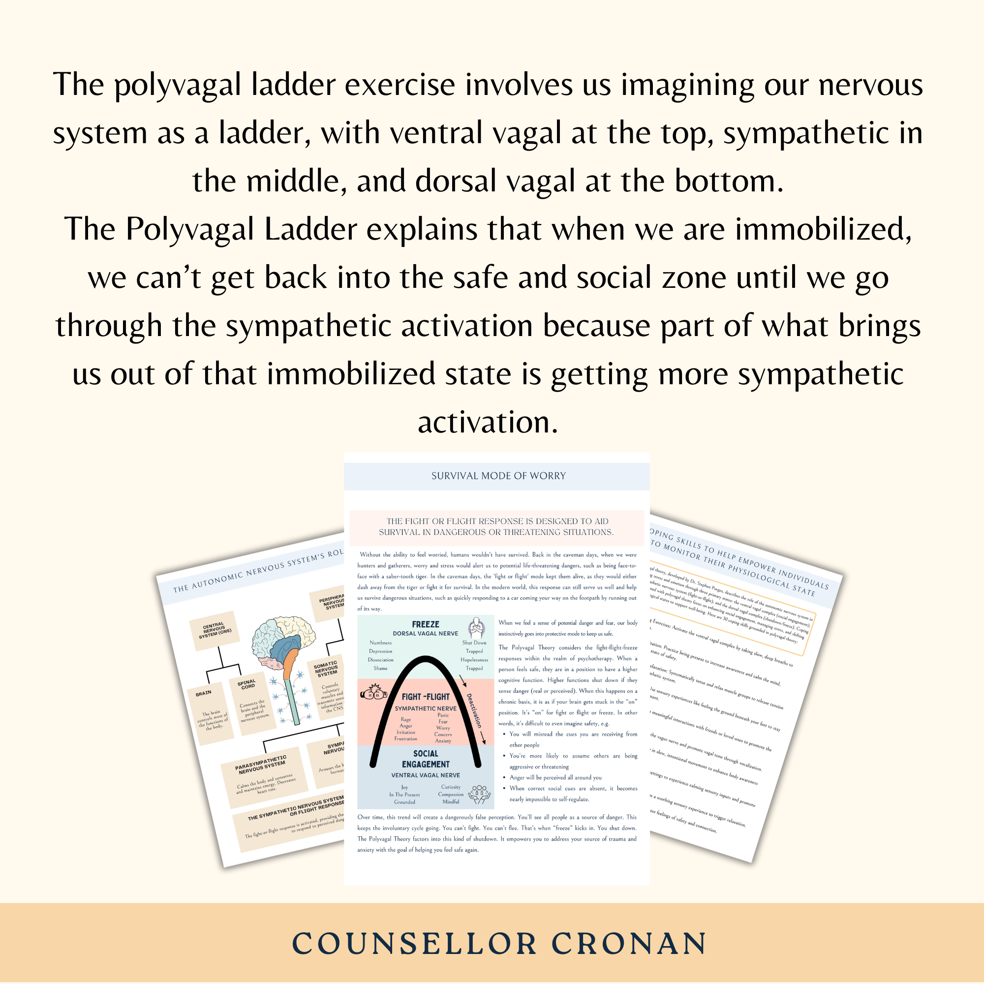 The polyvagal ladder exercise involves us imagining our nervous system as a ladder, with ventral vagal at the top, sympathetic in the middle, and dorsal vagal at the bottom.