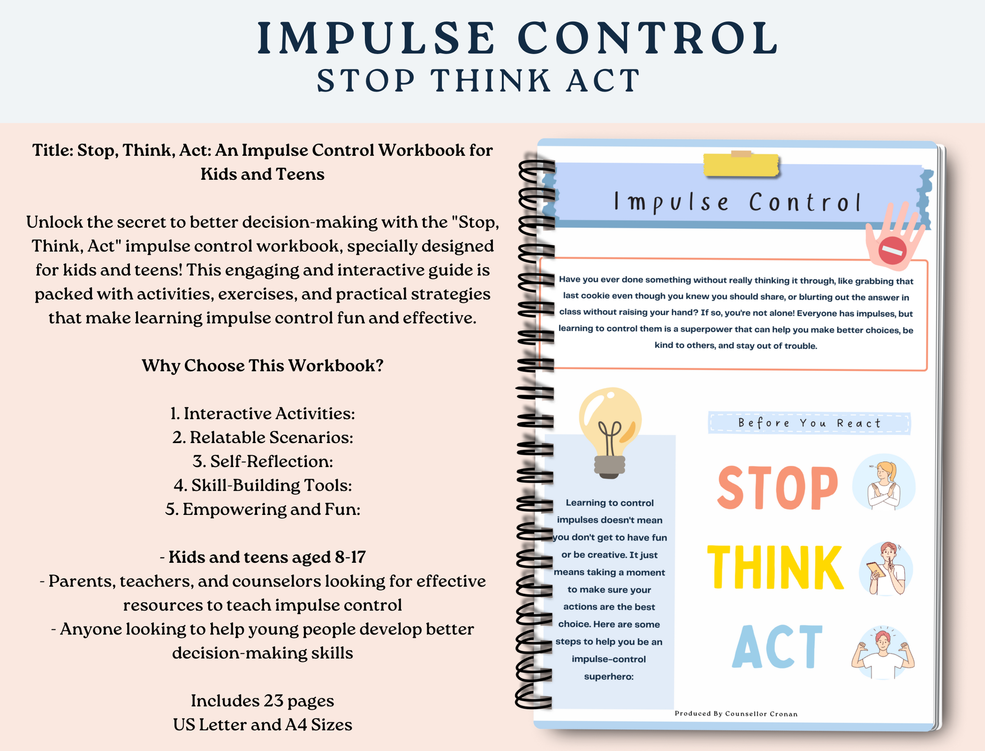 Unlock the secret to better decision-making with the "Stop, Think, Act" impulse control workbook, specially designed for kids and teens! This engaging and interactive guide is packed with activities, exercises, and practical strategies that make learning impulse control fun and effective.