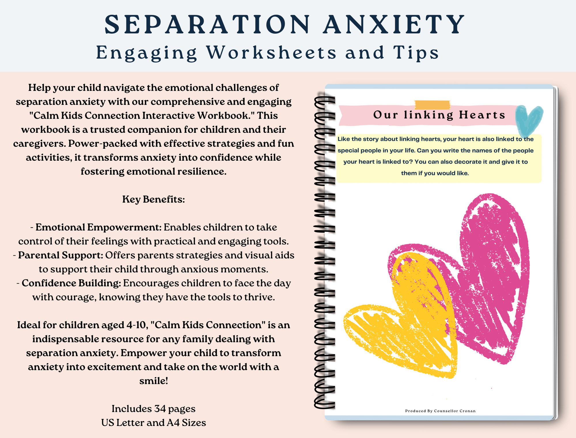 Help your child navigate the emotional challenges of separation anxiety with our comprehensive and engaging "Calm Kids Connection Interactive Workbook." This workbook is a trusted companion for children and their caregivers. Power-packed with practical strategies and fun activities, it transforms anxiety into confidence while fostering emotional resilience.