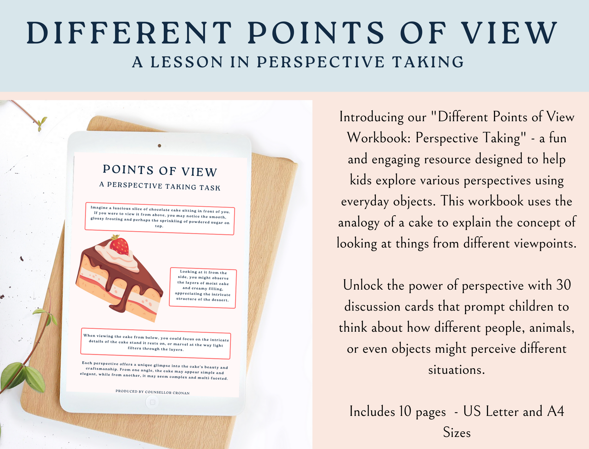 Introducing our "Different Points of View Workbook: Perspective Taking" - a fun and engaging resource designed to help kids explore various perspectives using everyday objects. This workbook uses the analogy of a cake to explain the concept of looking at things from different viewpoints.