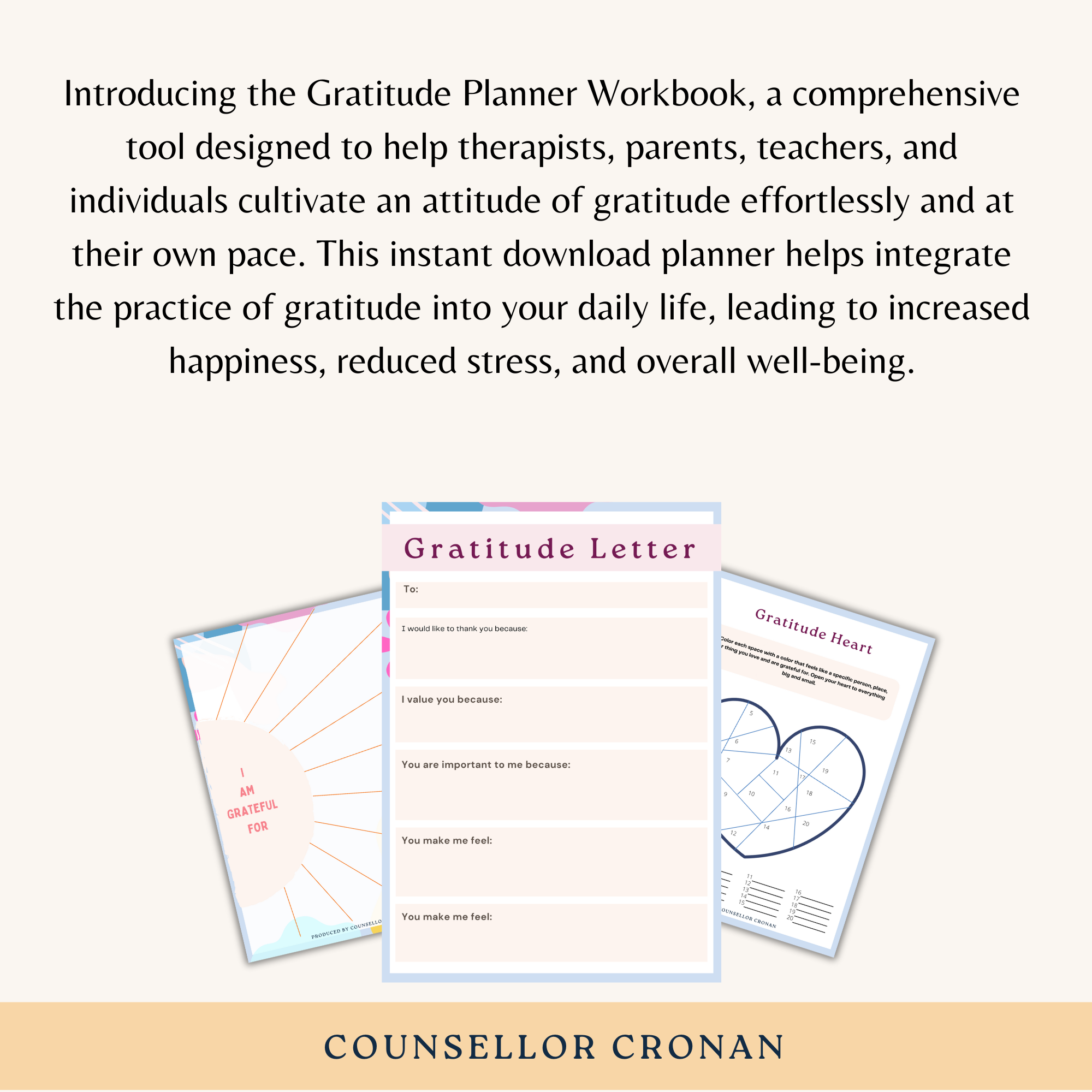 Introducing the Gratitude Planner Workbook, a comprehensive tool designed to help therapists, parents, teachers, and individuals cultivate an attitude of gratitude effortlessly and at their own pace. This instant download planner helps integrate the practice of gratitude into your daily life, leading to increased happiness, reduced stress, and overall well-being.